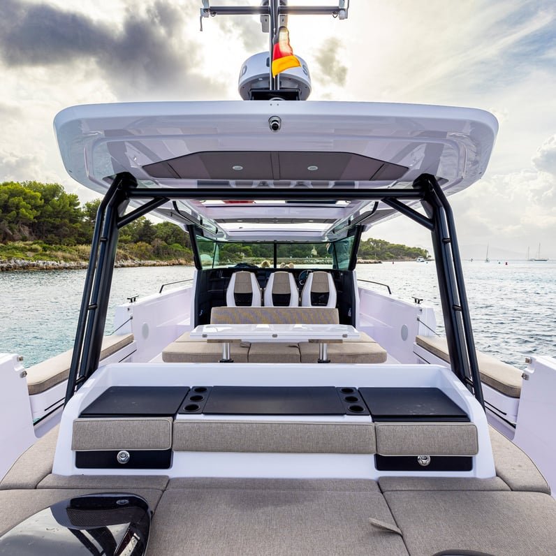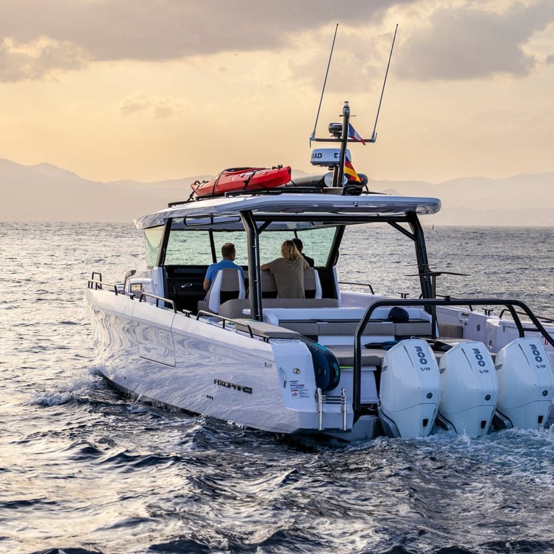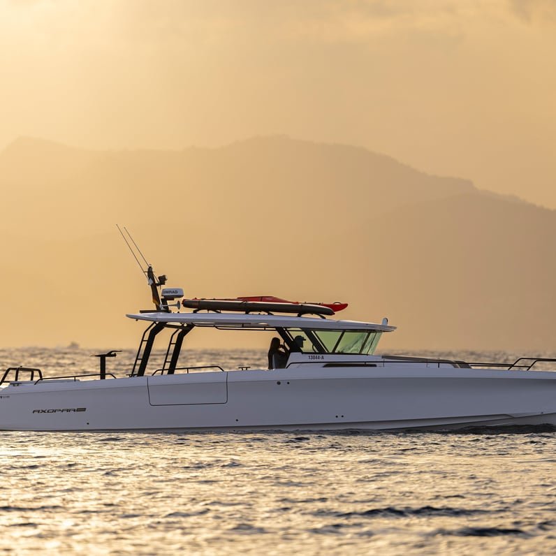 El Axopar 45 Cross Top es un híbrido entre los modelos Sun Top y Cross Cabin, con una selección de las mejores propiedades de la navegación abierta y cerrada. Su parabrisas envolvente de ángulo negativo protege contra el viento, la lluvia y el deslumbramiento, al tiempo que ofrece una visibilidad panorámica y capacidades de navegación mejoradas: una elección definitiva para profesionales y aventureros experimentados.