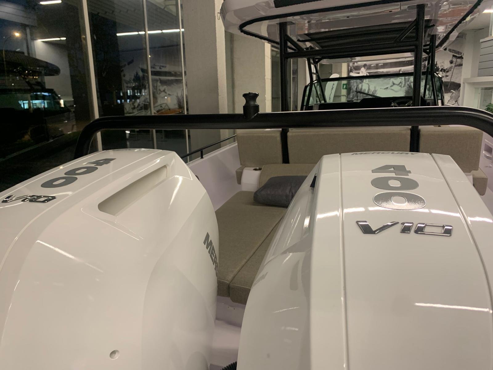 Equipped with the BRABUS Line and the impressive Mercury Verado V10 engines of 350 HP each, this Axopar reaches a top speed of 53 knots. Its aft layout, with the cabin at the stern, and the gullwing doors in the fore cabin, provide a practical and adaptable space, ideal for all kinds of adventures.