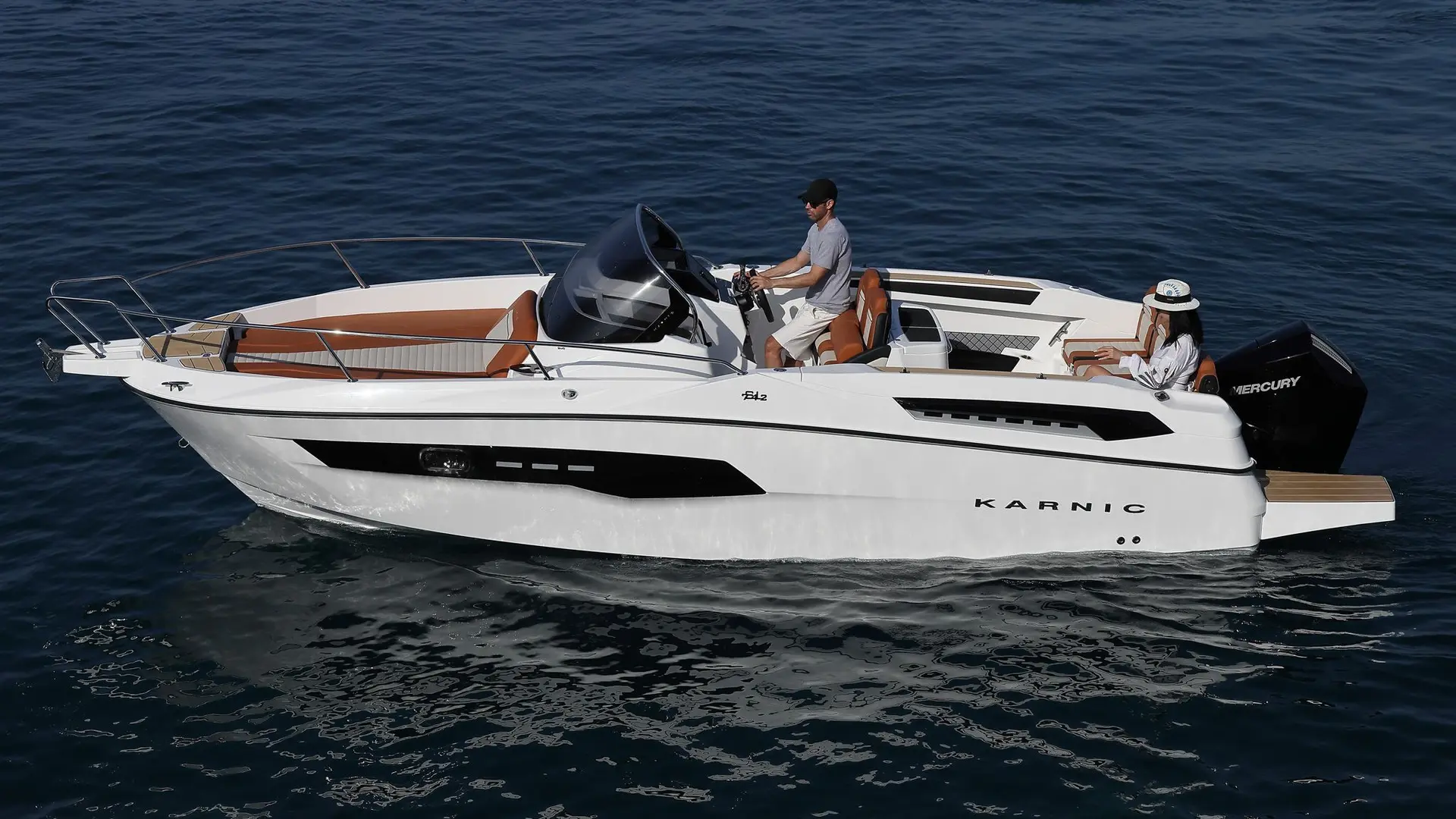 Le Karnic SL 742 est un bateau neuf, millésime 2026, conçu pour offrir un maximum de confort et de fonctionnalité, idéal pour profiter de la mer en famille ou entre amis. Avec une longueur totale de 7,95 mètres, longueur homologuée de 6,80 mètres et largeur de 2,45 mètres, il est homologué pour 8 personnes, combinant espace, design et grande navigabilité.