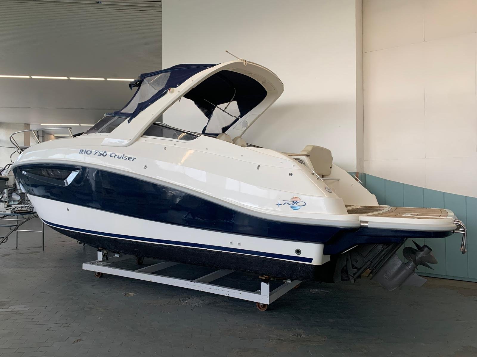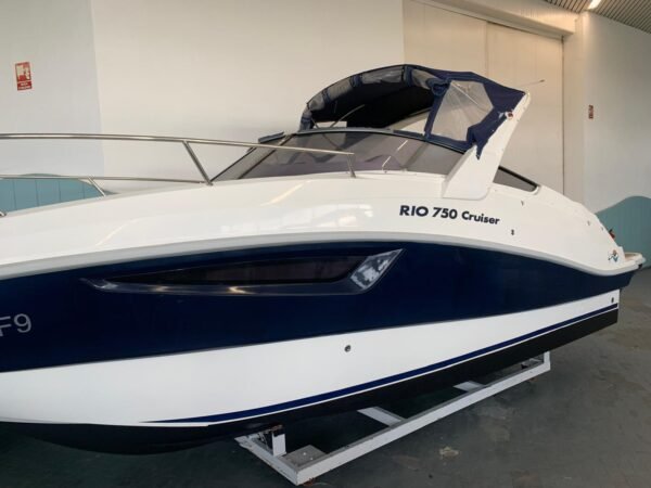 Le Rio 750 Cruiser est un bateau polyvalent et confortable, idéal pour des escapades d’une journée ou pour passer des nuits à bord. Avec une longueur totale de 8,60 m (7,49 m de longueur homologuée) et 2,52 m de largeur, il offre espace et habitabilité pour jusqu’à 7 personnes, combinant le confort d’un bateau à cabine avec les performances d’un bateau de sport.