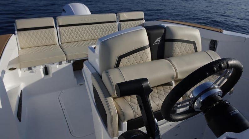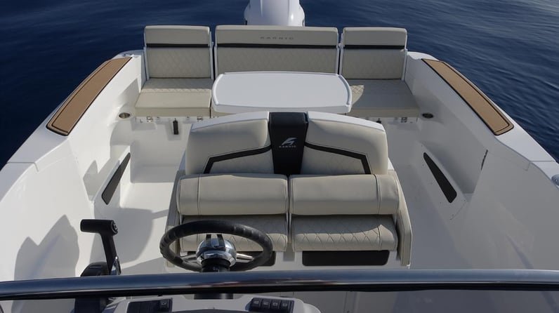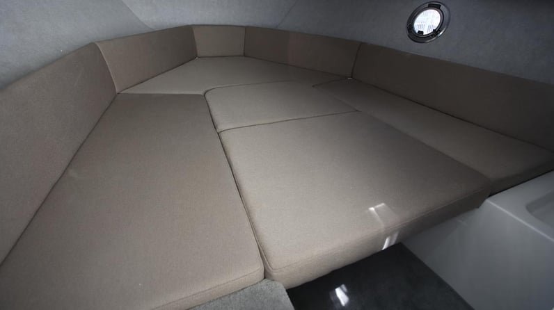 El diseño de consola central sigue siendo uno de sus mayores atractivos, permitiendo pasos laterales de popa a proa por ambos lados de la consola. Esto facilita el movimiento a bordo y fomenta la interacción entre los pasajeros. La popa destaca por su versatilidad: durante la navegación, ofrece un cómodo sofá en línea, y al anclar, se convierte en un sofá en U alrededor de la mesa, ideal para disfrutar de comidas. En pocos minutos, también se transforma en un amplio solárium, perfecto para relajarse al sol o bajo la sombra del toldo bimini.