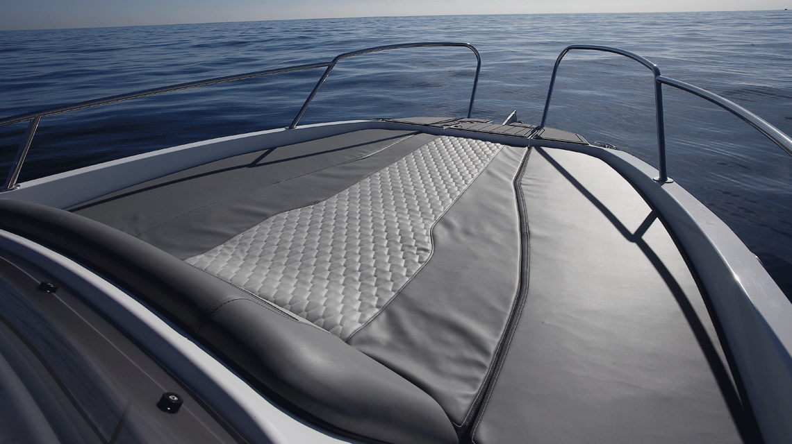 El diseño de consola central sigue permitiendo amplios pasos laterales de popa a proa, facilitando la circulación y fomentando la interacción entre los pasajeros. La popa, al igual que en otros modelos, ofrece un sofá en línea para navegar, que se transforma en un sofá en U alrededor de la mesa para disfrutar de comidas, y finalmente en un amplio solárium. Todo esto complementado con un toldo bimini que proporciona sombra y protección durante el día.